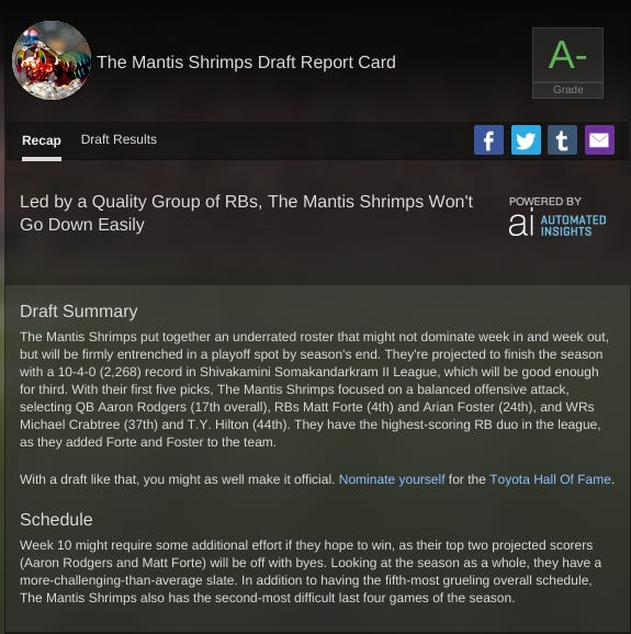 Tonight it was the first time draft a team that had defensive players though. And I must say, it adds an entirely new level to fantasy football especially since the ADP/rankings for defensive players are basically useless information in the Yahoo! system. You really need to be an avid football fan to really draft decent defensive players. But I think I put in an excellent effort in the draft and the automated analysis agreed: