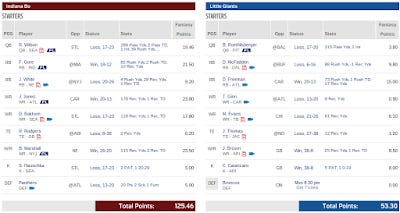 While it is sad streaks had to end, there is a reason to be optimistic though. My fantasy football team, Indiana Bo, is destined for its second championship! (in spectacular fashion as well, with the highest score in the league for the week after barely making the playoffs with a 8-6 record)