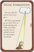 First of all, my undefeated streak in Munchkin has finally come to an end. I was on the verge of victory but the only card that could have altered the game's results was drawn as I knocked down the door. The card? The appropriately named card, Divine Intervention: