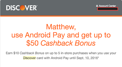 The push for mobile payments continues. Discover has sent out emails offering cash back for just using Android Pay with their Discover card: