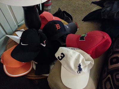 Things people wear- You name it and it's probably in our living room: Jackets, hoodies, caps, socks, shoes, etc. (None of my 10 or so caps are picture above too)