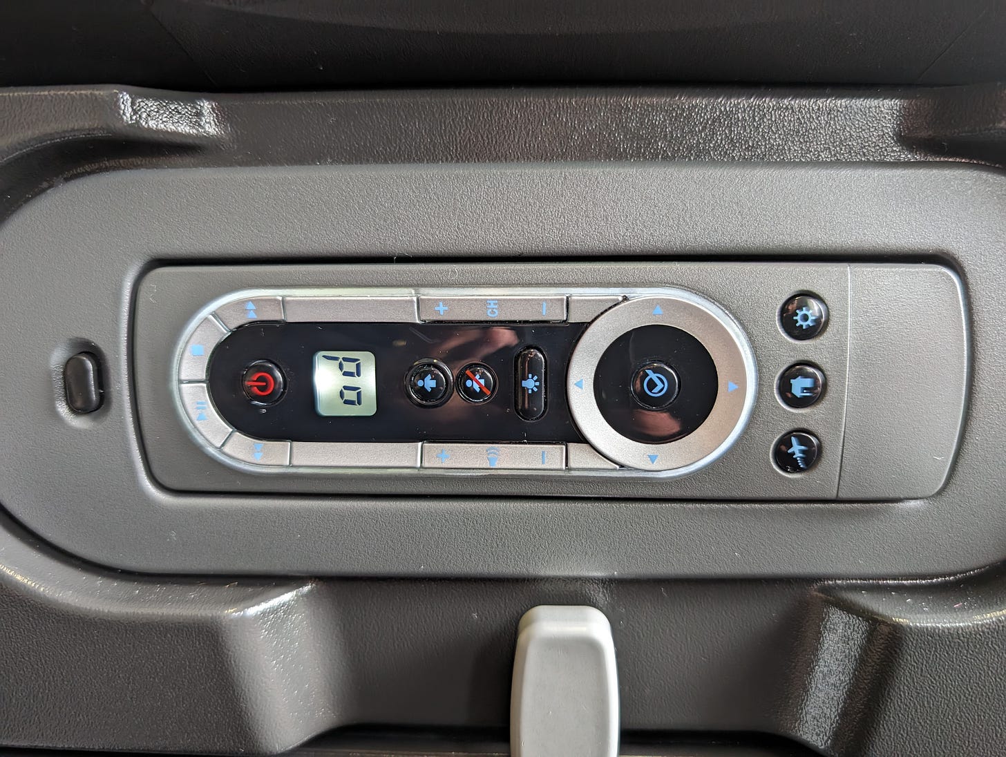 For those who have been fortunate to never have seen this on a flight, this is an armrest with controls to the display nested in it. As you can imagine, many accidental interactions occur because it’s on the armrest. Depending on your thoughts on middle seat armrest etiquette, the middle seat person often “owns” the armrest with control of a neighboring seat’s display.