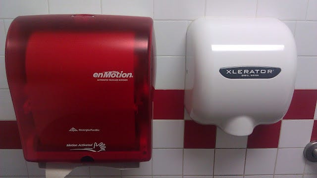 The question is if you see the automatic paper towel dispenser and air dryer, like above, which would you choose? I know which I would choose.