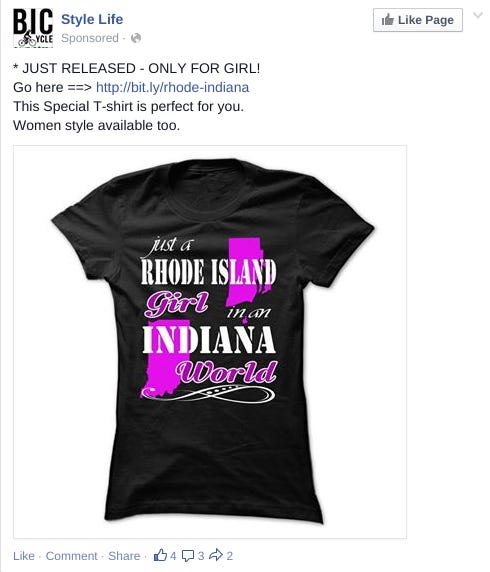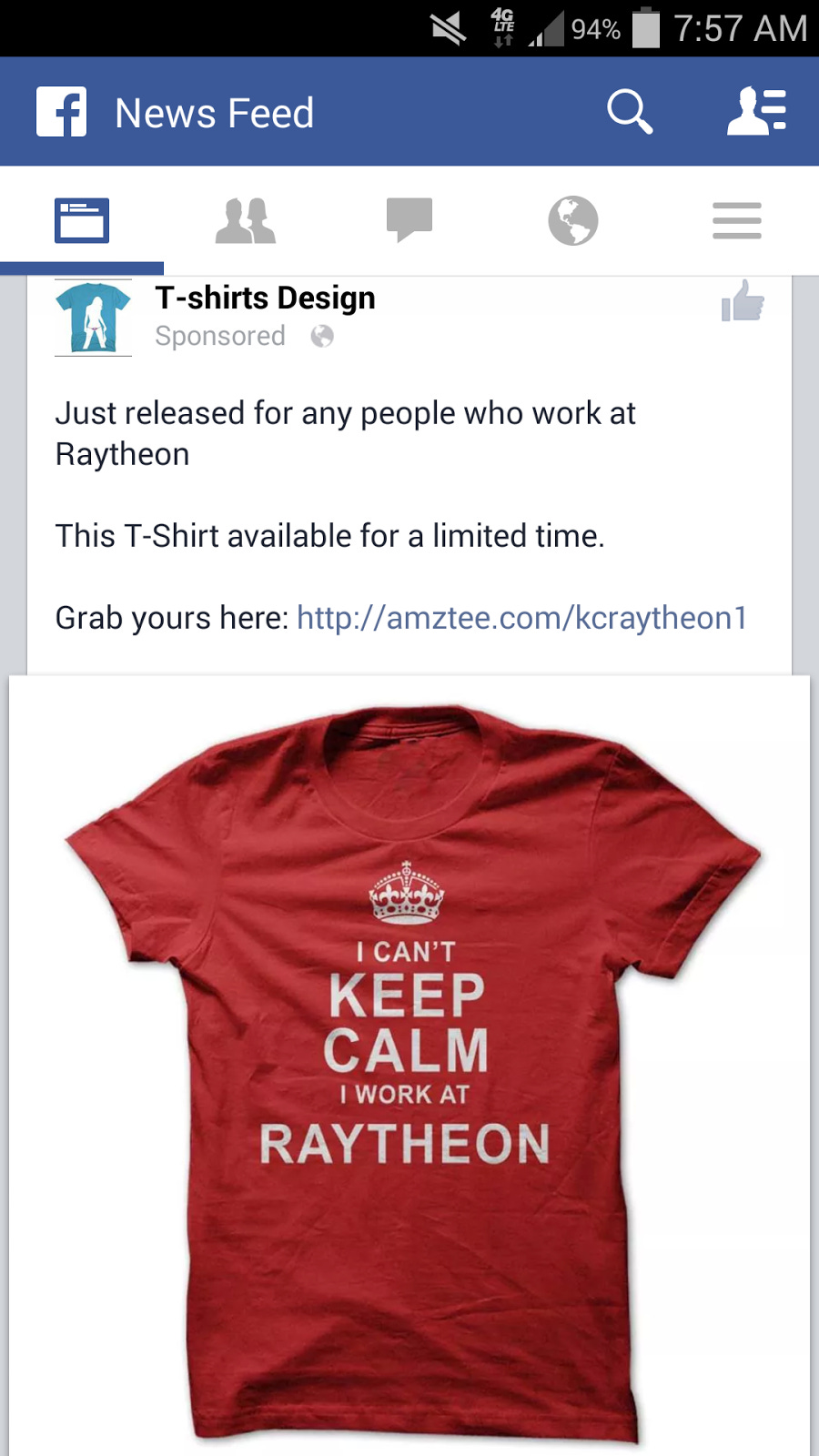 In both cases, they both took information from my profile (mostly likely public to everyone) and let advertisers target me. The first one is particularly interesting since it has two pieces of information, where I am from and where I currently am. A few months ago, I got an ad (which I didn't capture) that had something about being a UConn Husky fan in Indiana. While the shirts are decently personalized, it feels cheap and like it was concocted for pure profit. .I'm a simple man with simple fashion styles; words don't do it for me.