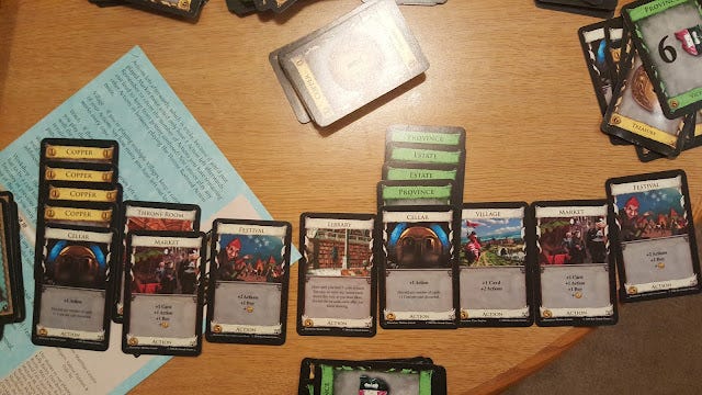 To explain what the game, Dominion, is: A game that includes building the best possible deck of cards to acquire the most number of "Victory" points at the end. Unlike Magic or Pokemon where you start with a pre-made deck of cards, the process of building your deck is part of the playing game. While there is some strategy in playing which cards you have in your hand, the majority of the game's strategy is in building your deck with the winning combination of cards.