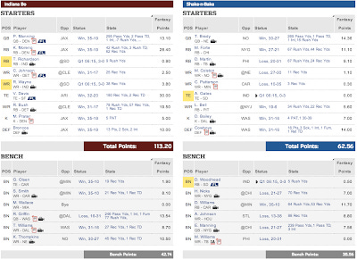 I have decided to call my fantasy football matches: Indiana Bo (4-2), Indiana Bo II (2-4), and The Mantis Shrimps (3-3). So that'll make me 2-1 for the week. Indiana Bo seems to be in championship form with a definitive win led by the Broncos players (Thanks Jacksonville!).