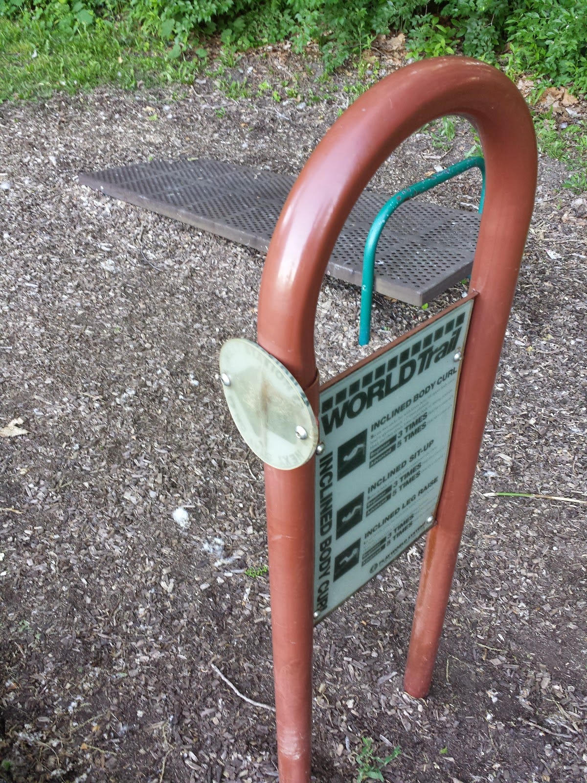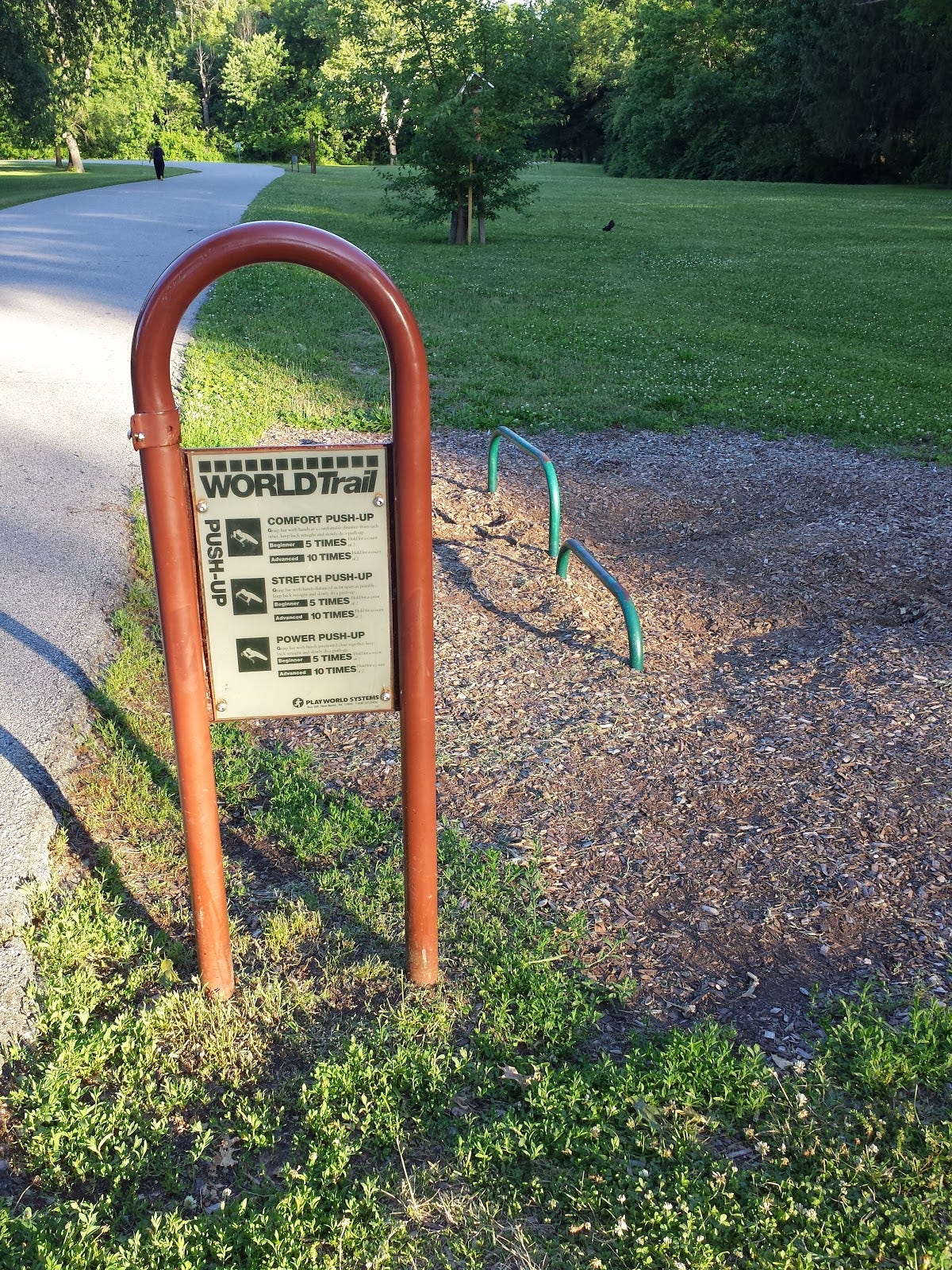 So what brings this topic up now? Well, I saw a similar concept at a nearby parks. On a trail in Foster Park, there are various fitness challenges every 100 yards or so. Exercises included push ups, pull ups, sit-ups and instructions were included.