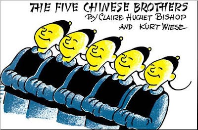 I can't recall whether if it was assigned reading in elementary school or if it was selected by me, I read The Five Chinese Brothers by Claire Huchet Bishop and Kurt Wiese. I don't know what my inspiration was to remember this short story but it just popped into my head.