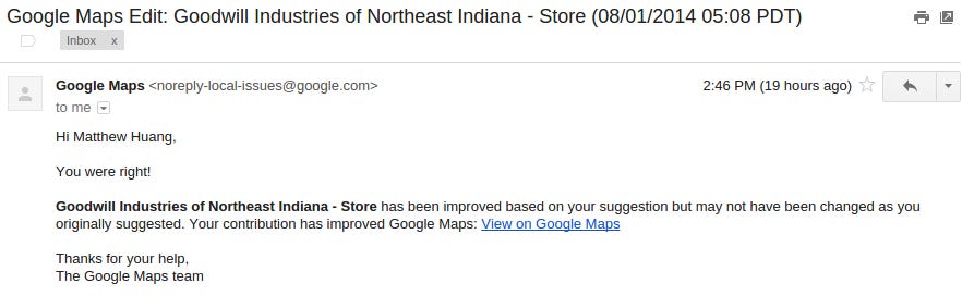 So lately, I've been going through Google Maps and correcting and updating places on there.... It's turned into hobby or even an obsession. Most of the time, I'm just updating the location to add increased accuracy. The entire report process crazy simple; you just go to the place and click "Report a problem". You can update most of the information (including if the place is closed), but it's annoying that the hours of operation cannot be reported.