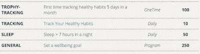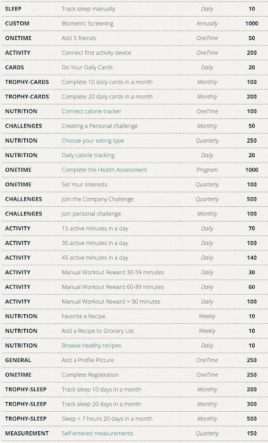 The implementation of the reward system is terrible; it is using the Virgin Pulse platform. While mainly a health tracking system, it was miserably tries to be a social network as well. You can see how points are awarded at the bottom of this post.