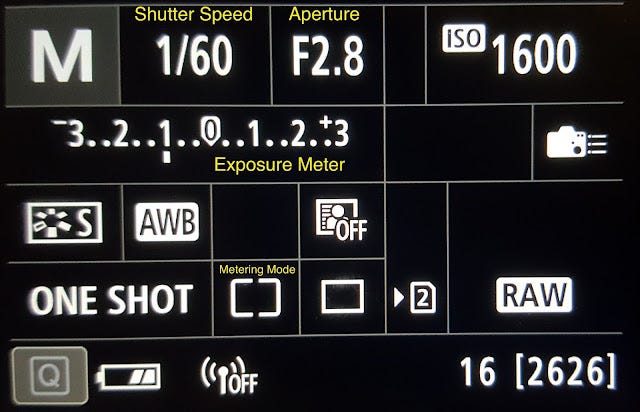 The exposure meter will show you how bright the settings are at currently. (The metering mode you're in matters too but that another topic for another time) Ideally, you want that at "0" or the "correct" exposure. In the photo above, the camera is 1 light stop underexposed (too dark).
