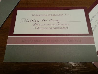 I never called myself "Mister" nor have I ever been called it regularly by anyone. It's such a odd tradition to include just a "M" on the response card. Is it because people wouldn't know what to put on that line? Would some people put the "Chicken" or "Beef" if the "M" was not there? Why am I complaining? I should be extremely satisfied since it saved me from writing an entire letter!