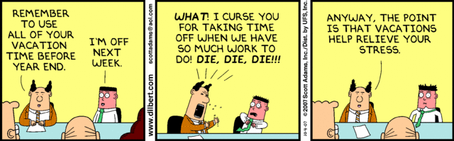 PTO, Personal Time Off. Or is it Paid Time Off? Some of you may call it vacation time. I know I'm not the only person that has trouble taking PTO (unlike the intern above); ironically, taking a vacation actually involves more work by making sure projects move forward and that everything is taken care of while you're gone. And the catching up on what happened while you were away isn't fun at all especially with the impossible number of emails to go through (wish our emails were threaded). It all about this whole work-life balance; doesn't vacation take work out of the work-life balance?!