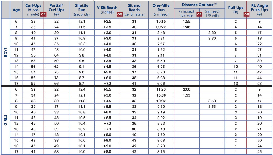 Presidential Physical Fitness Award Qualifying Standards (85th Percentile)
