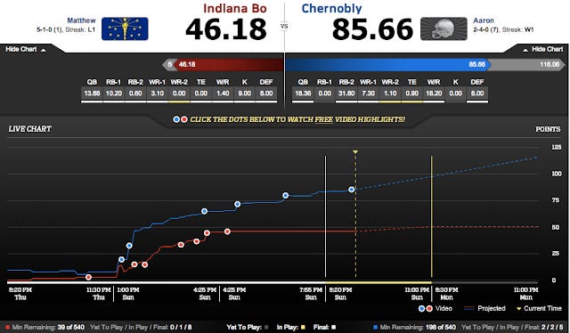 As you can see Indiana Bo was dominated for the second consecutive week. Chris Johnson ran all over Indiana Bo himself. It certainly didn't help that Jones-Drew, Crabtree, Davis, and Bryant came up with a combined 5.1 points... Can't win with that. Indiana Bo is really hurting right now but with the 5-0 start, I will remain in first place (probably tied though).