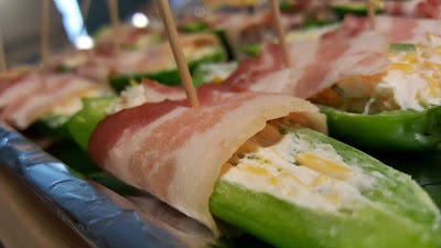 So easy to make: Some cream cheese, cheddar cheese, hollowed out jalapeno all wrapped in bacon.