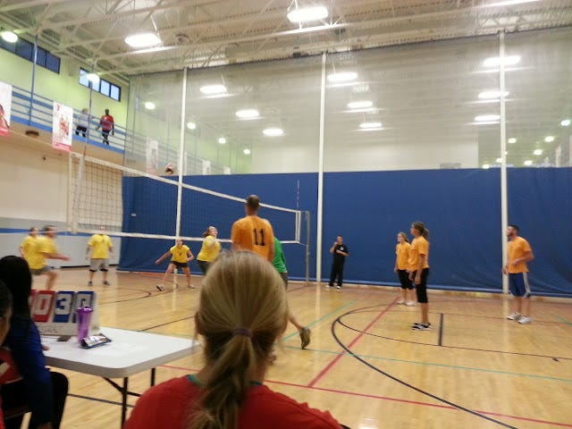 The volleyball portion of the Corporate Challenge was today. This time the two Raytheon teams did not meet up, unfortunately. So the Black Team was saved the embarassment of total destruction in volleyball.