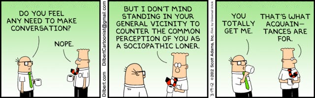 Dilbert plays the social habits of engineers. And it is quite amusing to read about things that people don't usually speak about. I cannot deny or confirm if the comic is correct. I enjoy the fact that Dilbert doesn't try to be like the rest of entertainment where everyone is outgoing and "perfect" socially (Who wants to be that definition of perfect though, it's boring). I think anyone who's had to deal with engineers have met a "Dilbert" before.