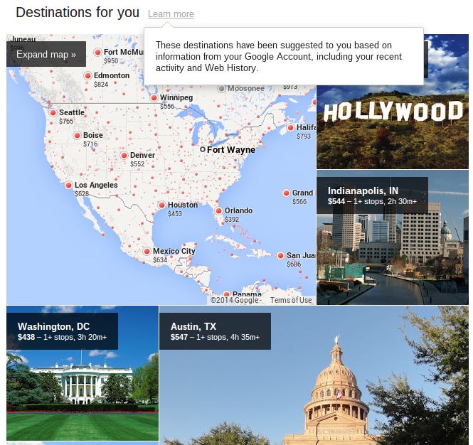 Google recently released the ability to see what destinations you may fly to based on user-specified price and time period. For someone who doesn't know where to travel and overwhelmed by choice, this is an amazing feature. If you are looking for a particular region, you can do that too. If you didn't know already, Google offered a flight-price search similar to other travel sites. But not the Google Flight site is even more personalize and is more user-friendly. Flights is even a major category search adding to Web/Images/Videos/Maps/Books/Shopping/News/Apps (I didn't notice apps until recently either).