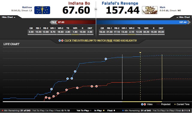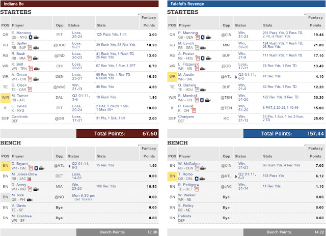 Yeah... I was devoured from the start; the Chargers' defense scored a huge 25 points on Thursday. Then, Brandon Marshall had a monster game as did the Chicago Bears (meaning Robbie Gould had a good game). Once again, Eli Manning had another terrible game. Otherwise, the rest of the team didn't have a bad week. I'm starting to think the thought of "We'll get them next week" isn't good enough... For the first time this season Indiana Bo will not be in first place.