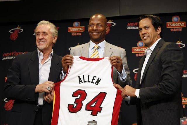 It is often said a picture is worth a thousand words. In the picture above of Walter Ray Allen being introduced to the Miami Heat, any Celtics fan may have strong (maybe hateful) words. I see a team that gained a classy and respectful player. I see a happy Ray Allen that is excited to play for the Heat with his true number, #34. It's just much more natural to see the number under his name on the jersey, as much as I rather see him with a Boston Celtic jersey.