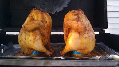 I don't know if I'm the only person in this world to have not seen this before yesterday. But I was introduced to beer chicken last night. Yes, those are Miller Lite cans in those chickens. I was pleasantly surprised with this idea and was quite excited to taste these wonderful looking chickens.