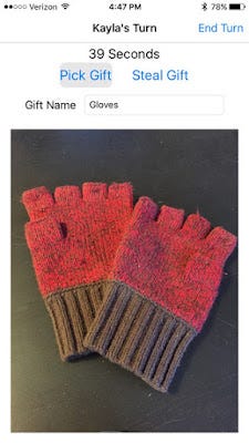 So a friend, Dan Niceswanger, quickly wrote up the iPhone/iPad app, White Elephant Gift Exchange, for this purpose. (I helped in the slightest!) This app is really simple and does the job well. And a great icon from Aaron Robles!