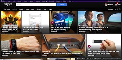 As you can see, Yahoo Tech is just as terrible (if not worse) than the other Yahoo sites. The front page is filled with messy various-sized tiles. There are also tons of click-bait ads integrated with the tech tiles. This is a pattern throughout Yahoo's sites and it seems that Yahoo has much worse ads (read click-bait) than its competitors like Facebook or Google. The experience of users clicking on them probably affects them negatively.